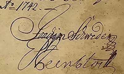 10. august 1742 skrev Fogden Joachim Schweder første siden i en «Gave bog» som det er bevart bruddstykker av: [8]