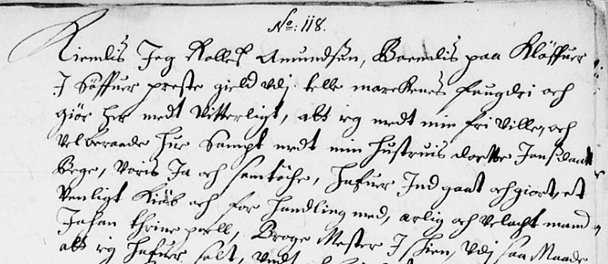 «Kiendis Jeg Rollef Amundsen, Boendis paa Kløffuer J Søffuer preste gield vdj telle marckens Fougdri och giør her medt vitterligt, att ieg medt min fri ville, och velberaade Hue Sampt medt min Hustruis Dortte Jonsdaatter Bege, Voris Ja och samtøche, Hafuer Jndgaat och giort, et Venligt Kiøb och for Handling med, ærlig och velagt mand Johan Trine poell, Borge Mester J Skien ..»